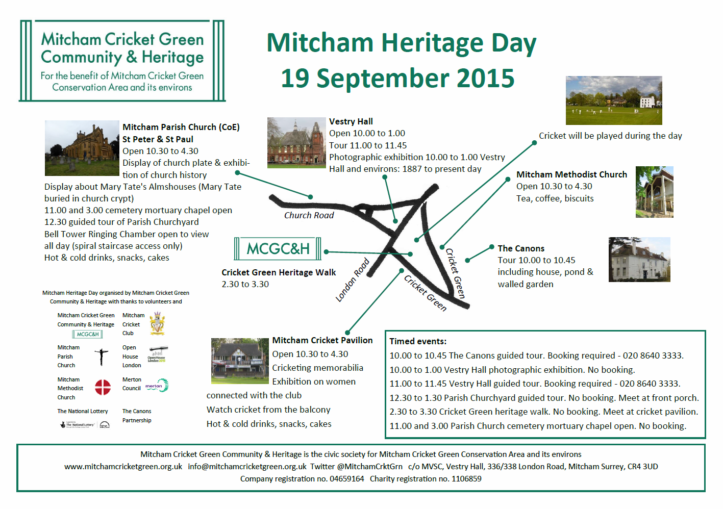 There are more details about the open buildings, walks and tours on our flyer. Download the Mitcham Heritage Day 19 September 2015 details as a PDF for high quality printing, or click the image below to see a larger version on screen.