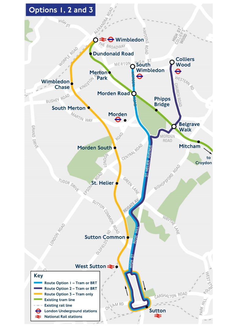 After years of concerted lobbying Transport for London is consulting on options for a tram or bus rapid transit route to Sutton town centre. One option would link to South Wimbledon and another to Colliers Wood.