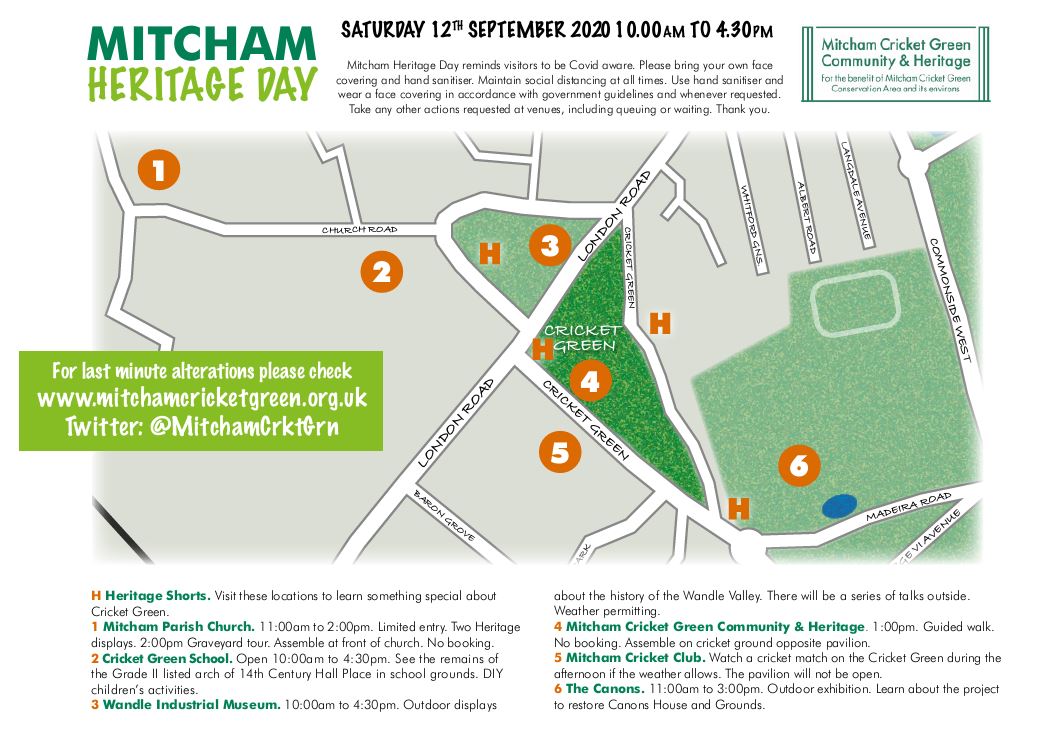 Mitcham Heritage Day reminds visitors to be Covid aware. Please bring your own face covering and hand sanitiser. Maintain social distancing at all times. Use hand sanitiser and wear a face covering in accordance with government guidelines and whenever requested. Take any other actions requested to at venues, including queuing or waiting. Thank you.