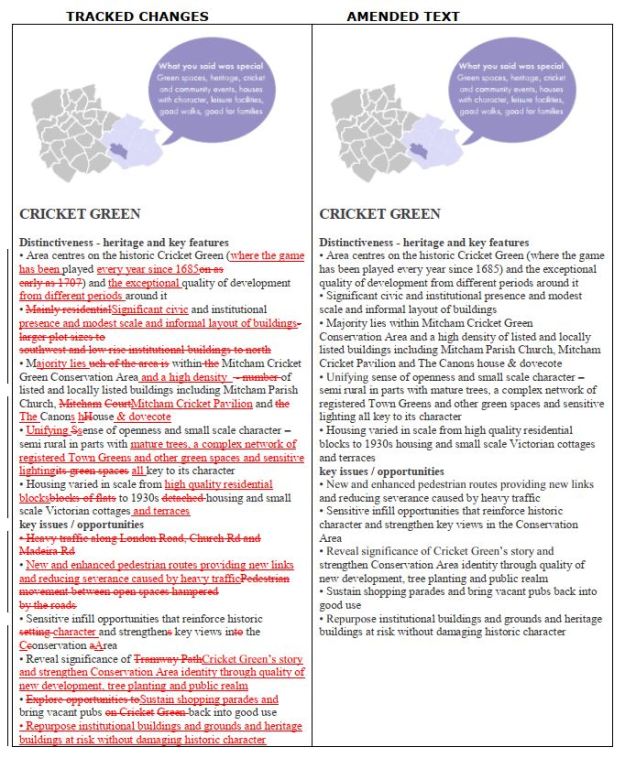The new Management Plan is virtually silent on some important outlying areas of Mitcham Common, including the significant area which lies within Mitcham Cricket Green Conservation Area around Mitcham Garden Village and running south towards Mill Green. This area has been threatened by a new access road to Willow Lane Industrial Estate and is one of many subject to significant and persistent flytipping.